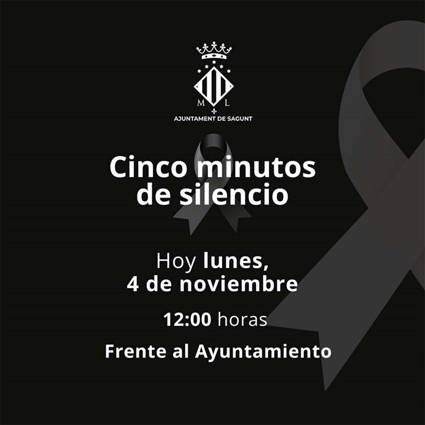 La Corporación del Ayuntamiento de Sagunto, y una numerosa representación de la sociedad saguntina se han concentrado este lunes al mediodía a las puertas del consistorio para guardar cinco minutos de silencio en señal de luto por las víctimas de la DANA, que recientemente ha asolado varios municipios en la provincia de Valencia.