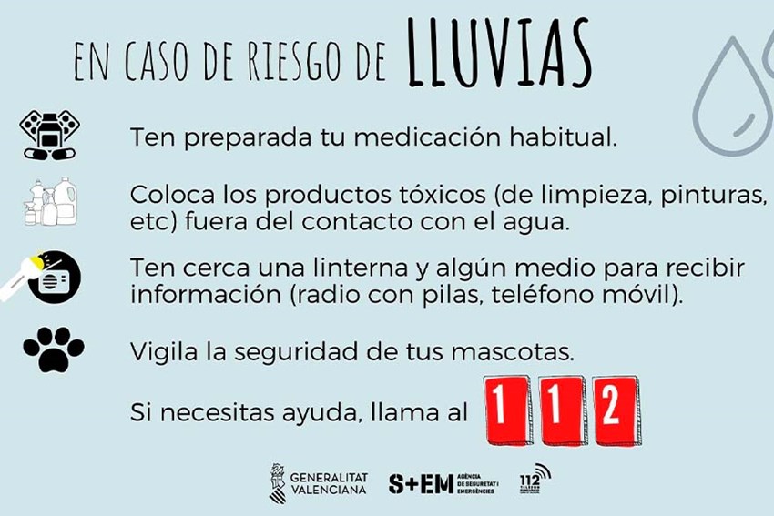 Ante posibles episodios de lluvias intensas, se solicita a la ciudadanía que extreme las precauciones y que, en todo caso, se mantenga informada de los avisos oficiales del Ayuntamiento de Sagunto, AEMET y el 112, además de seguir las siguientes recomendaciones: