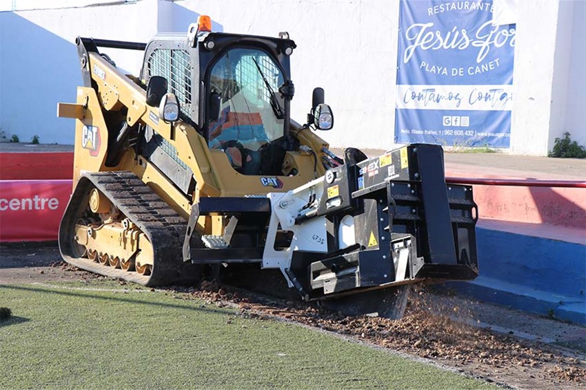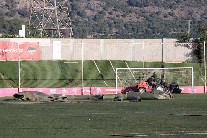 El Ayuntamiento de Sagunto ha iniciado las obras de remodelación del terreno de juego del estadio Nou Camp de Morvedre, sede del Club Atlético Saguntino. Han comenzado este miércoles con la retirada del césped artificial que hay instalado actualmente y la apertura de zanjas para la colocación del nuevo sistema de riego.