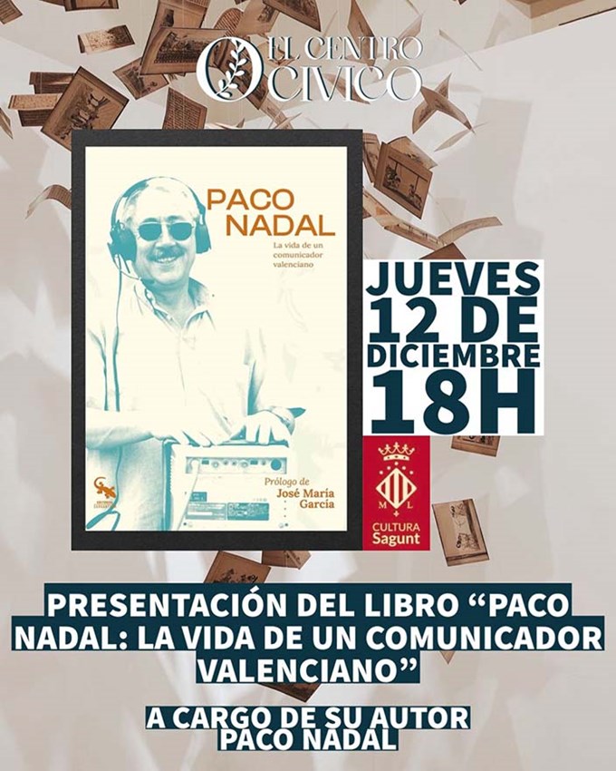 El periodista valenciano Paco Nadal, una de las voces pioneras de la radiotelevisión pública valenciana, presentará su obra Paco Nadal: la vida de un comunicador valenciano en la cafetería del Centro Cívico Antiguo Sanatorio de Puerto de Sagunto este jueves, 12 de diciembre, a las 18:00 horas.
