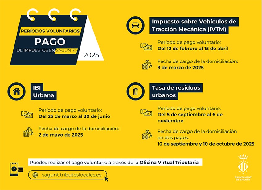 La información completa con el calendario de pagos detallado y las instrucciones para formalizar el abono de los mismos se puede encontrar en el Calendario Fiscal del Contribuyente 2025 publicado en la página web institucional del Ayuntamiento de Sagunto.