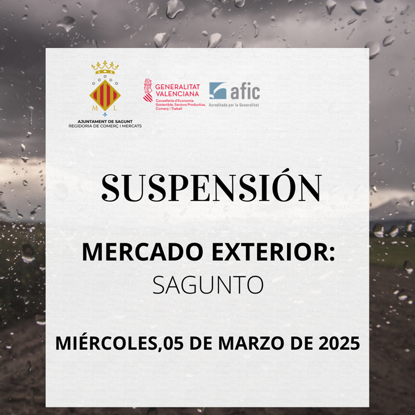 La Concejalía de Comercio y Mercados del Ayuntamiento de Sagunto ha decretado la suspensión del mercado exterior fijo que se iba a instalar mañana miércoles en el núcleo de Sagunto.