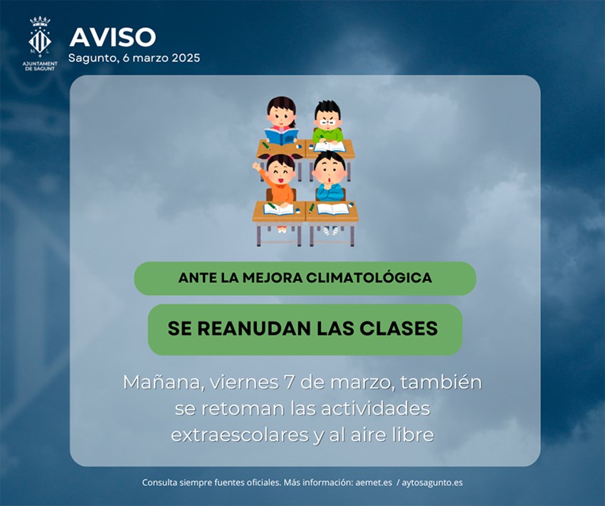 La actividad escolar y educativa en toda la comarca del Camp de Morvedre se retomará con normalidad mañana, viernes 7. Así lo ha determinado el Grupo de trabajo de Emergencias comarcal, en reunión de seguimiento, teniendo en cuenta que mañana no se encuentra vigente ningún aviso por precipitaciones intensas.