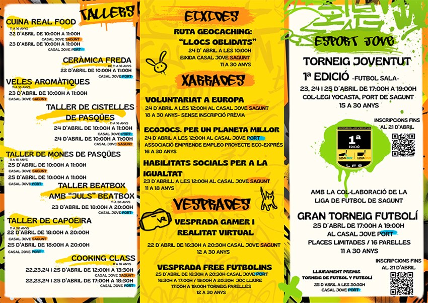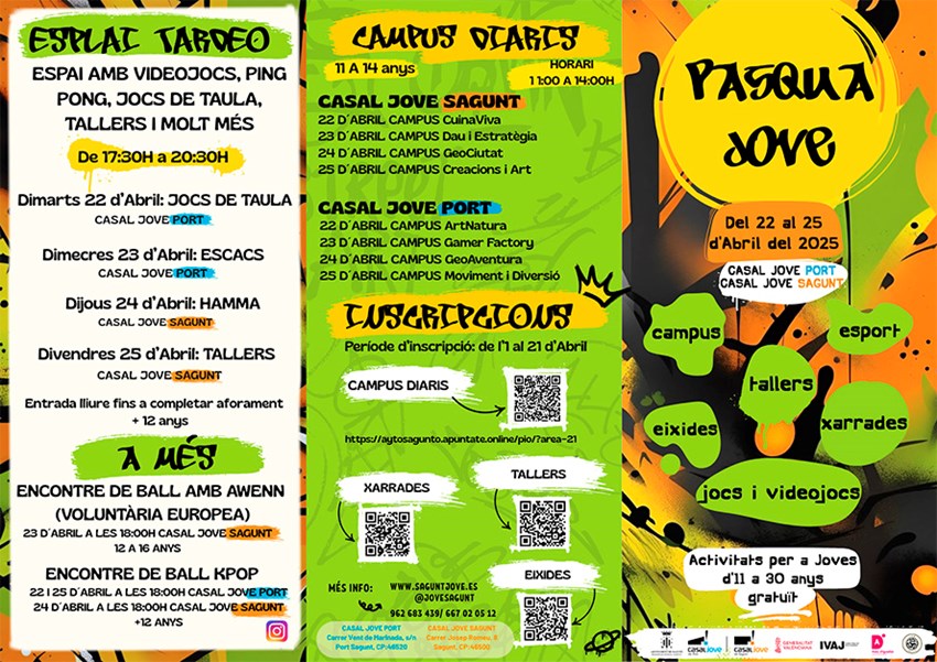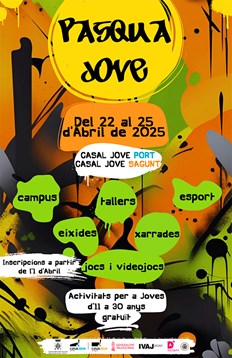 La Concejalía de Juventud e Infancia del Ayuntamiento de Sagunto organiza, un año más, Pasqua Jove 2025, una iniciativa gratuita llena de actividades dirigidas a jóvenes de 11 a 30 años. Del 22 al 25 de abril, el Casal Jove de Sagunto y el de Puerto de Sagunto serán el epicentro de una programación variada con campus, talleres, charlas, deportes, torneos y actividades lúdicas.
