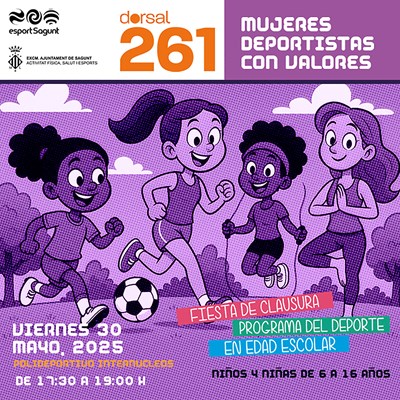 El programa de la Concejalía de Actividad Física, Salud y Deportes, ‘Deporte en Edad Escolar’, celebra su fiesta de clausura el viernes 30 de mayo de 17 a 19 horas en el Polideportivo Municipal (internúcleos) con el lema “Mujeres con valores”. La actividad está dirigida a menores de entre 6 y 16 años y también incluye el programa de fomento de la igualdad en el deporte Dorsal 261.