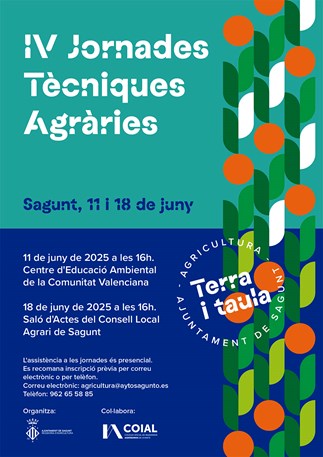 El departamento de Agricultura del Ayuntamiento de Sagunto, en colaboración con el Colegio de Ingenieros Agrónomos de Levante (COIAL) y la Comunidad de Regantes de Sagunto, organiza las IV Jornadas Técnicas Agrarias, que se celebrarán los días 11 y 18 de junio, miércoles en ambos casos, y que tienen por objetivo proporcionar formación sobre los temas que preocupan a los agricultores del municipio.