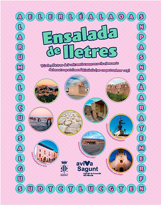 Además, se amplía la campaña con novedades como la edición de banderines con el lema para todos los casales y locales festivos y con unos juegos gigantes, elaborados por el personal técnico de AVIVA Sagunt, con sopas de letras para público infantil y una ensalada de letras sobre el patrimonio histórico del municipio, así como los conocidísimos roscos de Passapalabra con vocabulario en valenciano.