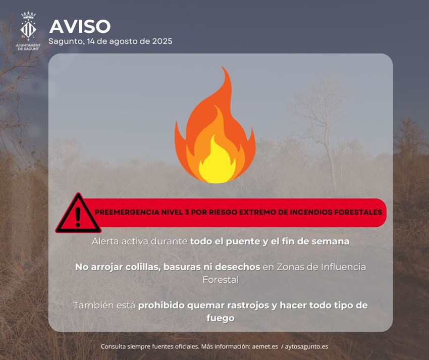 De otro lado, se mantiene el nivel 3 (peligrosidad extrema) de riesgo de incendios según el sistema PREVIFOC, con lo que conviene extremar las precauciones en zonas forestales y en un radio de 500 metros alrededor de las mismas. Por supuesto, está prohibido encender cualquier tipo de fuego, incluidas las quemas que estuviesen previstas y autorizadas antes de que se elevase la preemergencia.