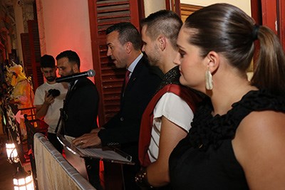 El pregón se ha desarrollado en el Consistorio con la presencia también del alcalde de Sagunto, Darío Moreno; la concejala de Fiestas y Cultura Popular, Patricia Sánchez; el presidente de la Asociación de Moros y Cristianos de Sagunto, Patrick Salvador; otros concejales y otras concejalas del Ayuntamiento de Sagunto; el comisario de la Policía Nacional; el presidente y las falleras mayores de la Federación Junta Fallera de Sagunto (FJFS); el presidente y la responsable de protocolo de la Associació Cultural de Penyes de les Festes Patronals de Sagunt, Ricardo Meliá y Anaïs Aparicio respectivamente; representantes de la Federación de Peñas de Puerto de Sagunto así como de la Mayoralía de la Cofradía de la Purísima Sangre de Nuestro Señor Jesucristo.