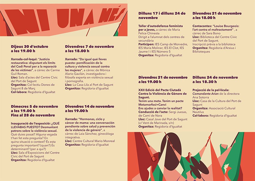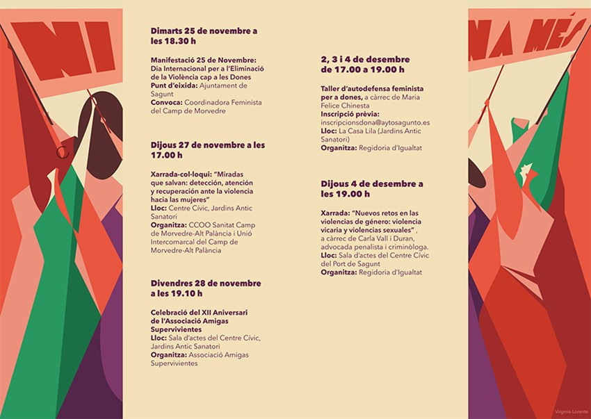 El área de Igualdad del Ayuntamiento de Sagunto ha presentado una variada y extensa programación municipal por el 25N, así como una campaña de concienciación bajo el lema Masclisme al fem, feminisme al carrer. Cabe destacar que la Coordinadora Feminista del Camp de Morvedre ha convocado la manifestación del Día Internacional por la Eliminación de la Violencia hacía las Mujeres (25 de noviembre) a las 18:30 con salida desde el Consistorio de Sagunto. La programación completa se puede consultar en la web municipal.