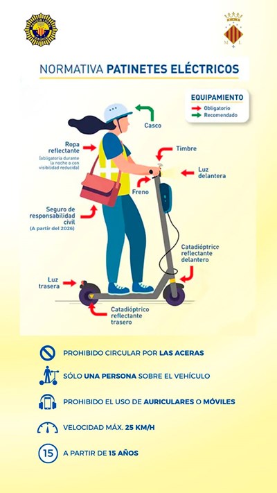 La ordenanza municipal de circulación en materia de vehículos de movilidad personal requiere una edad mínima de 15 años para su conducción y limita la velocidad máxima a 25 km/h. Cabe recordar que no se permite a la persona conductora de un patinete transportar a pasajeros, así como el uso de auriculares o móviles. A este tipo de vehículos se les permite circular por carriles-bici y aceras-bici, pero no por aceras y zonas peatonales.