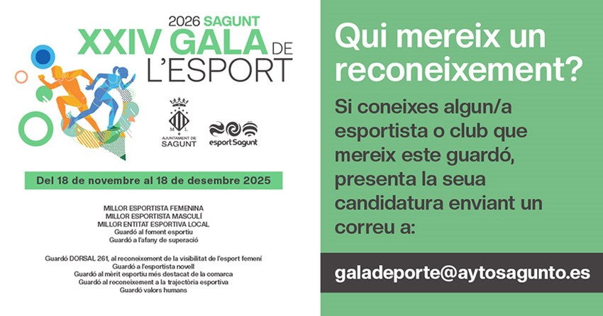 Cada persona o club solo se podrá presentar en una de las 10 categorías premiadas. El jurado de la Gala del Deporte evaluará todas las candidaturas presentadas a tiempo y elegirá las premiadas. Las candidaturas se deben presentar a través del correo galadeporte@aytosagunto.es, indicando el nombre del o la deportista o club propuesto, la categoría a la que se presenta, la justificación y los datos de contacto.