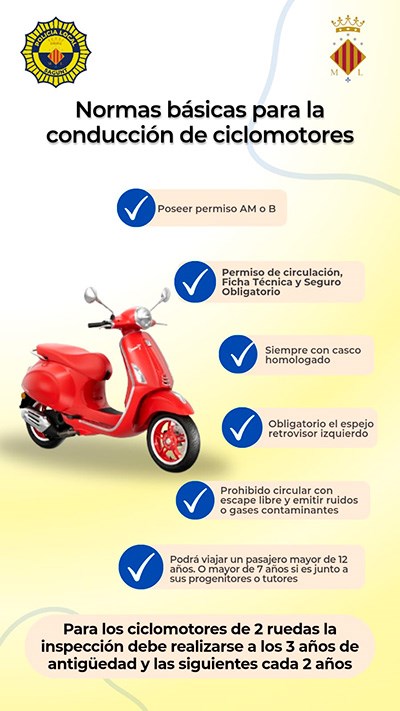 Las normas básicas para la conducción de ciclomotores son: poseer el permiso AM o B, tener permiso de circulación, ficha técnica y seguro obligatorio, circular siempre con casco homologado, uso obligatorio del retrovisor izquierdo, prohibido circular con escape libre y emitir ruidos o gases contaminantes y la posibilidad de viajar un pasajero de 12 años o mayor de 7 años si es junto a sus progenitores o tutores. Además, se recuerda que para los ciclomotores de dos ruedas la inspección debe realizarse a los 3 años de antigüedad y las siguientes cada dos años.