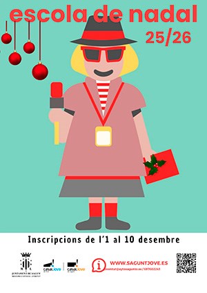 De otro lado, l'Escola de Nadal, organizada por el departamento de Juventud e Infancia, consciente de la importancia de dotar de contenido el tiempo libre de la infancia durante las vacaciones, se desarrollará en el Casal Jove de Puerto de Sagunto y en el CEIP José Romeu de Sagunto los días 23, 26, 29 y 30 de diciembre y el 2 de enero en horario de 9:00 a 14:00 horas, con posibilidad de hacer uso del Espai Concilia desde las 8:00 horas.