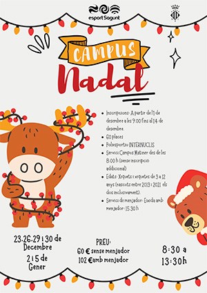 En lo que respecta al Campus Nadal, organizado por el departamento de Actividad Física, Salud y Deportes, tendrá lugar en su ubicación habitual, el Polideportivo Municipal (Internúcleos), los días 23, 26, 29 y 30 de diciembre y el 2 y el 5 de enero en horario de 8:30 a 13:30 horas. No obstante, habrá servicio Campus Matiner desde las 8:00 horas, sin necesidad de hacer una inscripción adicional, y en el caso de los niños y las niñas que tengan el servicio de comedor la salida será a las 15:30 horas.