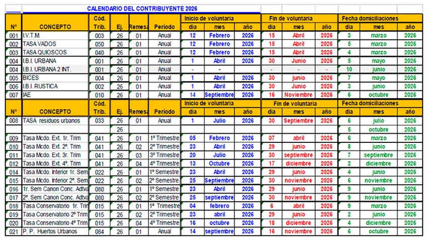 El 4 de febrero empezará el plazo para abonar el pago del primer trimestre de la tasa de Conservatorio, que acabará el 6 de abril. Luego, el día 5 empezará el plazo para pagar el primer trimestre de la tasa del Mercado Exterior, y acabará el 7 de abril. El 12 de febrero comenzará el plazo para pagar el Impuesto de Vehículos de Tracción Mecánica (IVTM), la tasa de Vados y la tasa de Quioscos, y finalizará el 15 de abril.