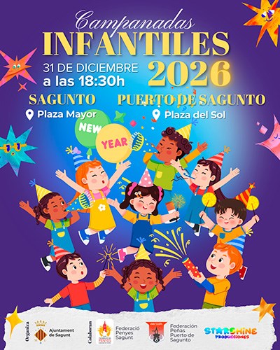 En esta ocasión, a las 18:30 horas se celebrarán las campanadas infantiles para los niños y niñas de la ciudad. En Sagunto, serán en la plaza Mayor y, en Puerto de Sagunto, en la plaza del Sol.