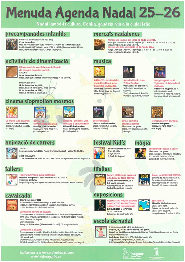 El Ayuntamiento de Sagunto ha presentado la completa programación que han preparado varias concejalías para la Navidad 2025-2026, en la que se incluyen los tradicionales mercados navideños, la llegada y la cabalgata de Reyes, las orquestas de Nochevieja y un sinfín de actividades culturales y de ocio y entretenimiento para todos los públicos, en especial la infancia.