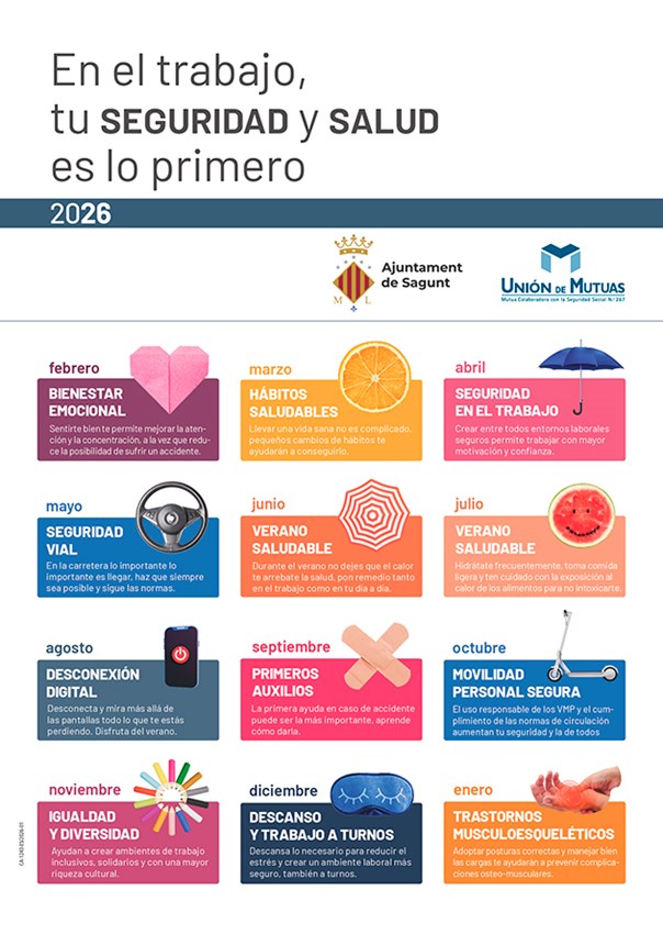Los asuntos sobre los que pondrá el acento esta iniciativa a través de cartelería, folletos informativos y videos que se reproducirán en las pantallas de las salas de espera de los edificios municipales son: el bienestar emocional (febrero), los hábitos saludables (marzo), la seguridad en el trabajo (abril), la seguridad vial (mayo), el verano saludable (junio y julio), la desconexión digital (agosto), los primeros auxilios (septiembre), la movilidad personal y segura (octubre), la igualdad y la diversidad (noviembre), el descanso y el trabajo a turnos (diciembre) y, por último, los trastornos musculoesqueléticos (enero).