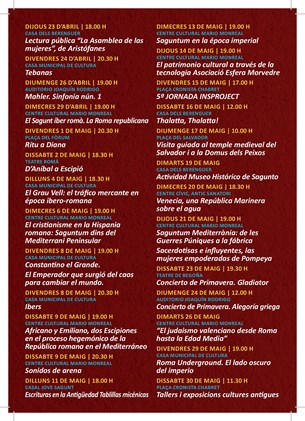 Para el martes 26 de mayo está programada la ponencia El judaísmo valenciano desde Roma hasta la Edad Media, en el Centro Cultural Mario Monreal. Después, el día 29 se impartirá la conferencia a cargo de Paco Álvarez Roma Underground. El lado oscuro del imperio, a las 19 horas en la Casa Municipal de Cultura. El sábado 30 se llevarán a cabo talleres y exposiciones de culturas antiguas a las 11:30 horas en la plaza Cronista Chabret.