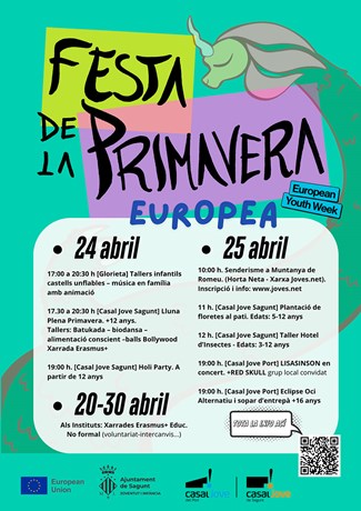 La Concejalía de Juventud e Infancia del Ayuntamiento de Sagunto organiza la segunda edición de la Fiesta de la Primavera, en la que los grupos de participación juveniles y el voluntariado joven estarán presentes en las actividades de forma activa. En esta ocasión tiene a Europa como tema central al coincidir con la Semana Europea de la Juventud.