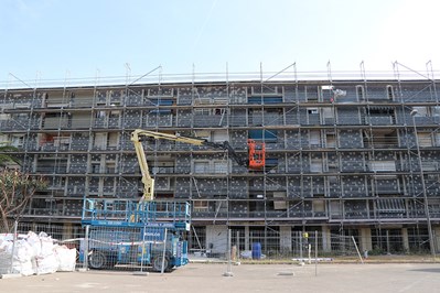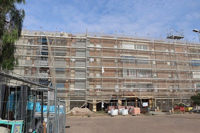En la plaza Jacinto Benavente se están rehabilitando tanto la parte más cercana a la calle Poeta Querol como la más próxima a la calle Azorín. En total, supone una actuación en 19 edificios en los que hay 304 viviendas. El proyecto completo contempla el aislamiento de las fachadas y la impermeabilización de las cubiertas, así como la retirada del amianto de bajantes exteriores y la mejora de la accesibilidad mediante rampas y ascensores.