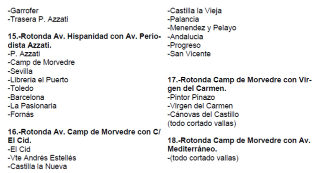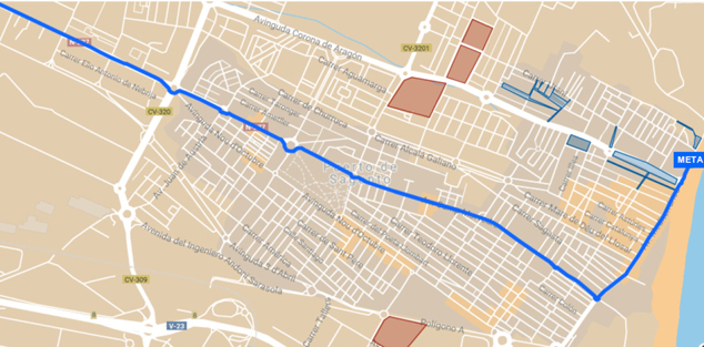 Además, en el núcleo de Puerto de Sagunto, desde el día anterior quedarán cortadas y sin vehículos estacionados, también a partir de las 15.00 h, una serie de calles de dos zonas próximas a la meta, situada en la zona norte de la avenida Mediterráneo: calles del entorno del Casal Jove y de la urbanización Ciudadmar. En concreto, estas calles son: Vent de Gregal, Vent de Marinada (y todas sus perpendiculares), Vent de Provença, Isla Córcega, Isla Amboto, Isla Menorca, Río Turia, avda. Delta del Río y aparcamiento Padre Jaime (frente al colegio Vilamar).