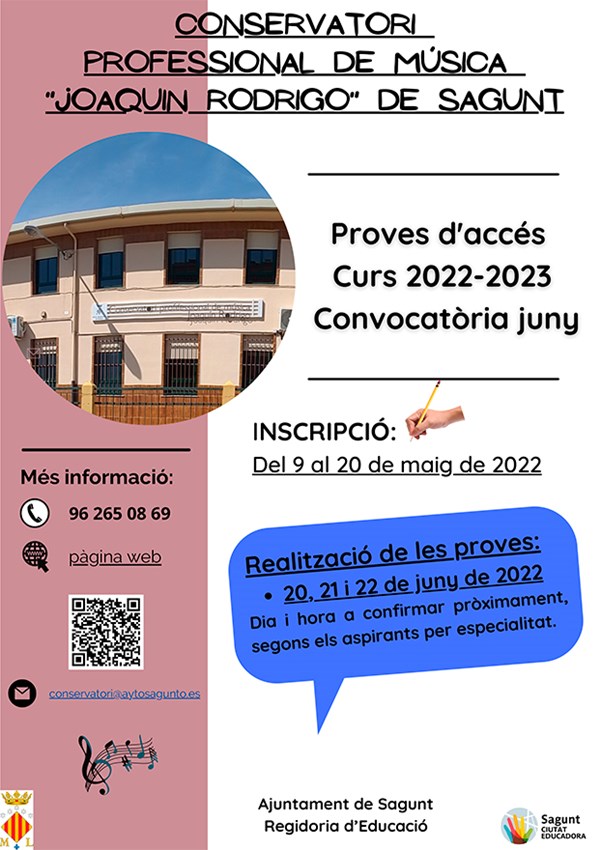 Para más información se puede acceder a la página web del Conservatorio, en el apartado referente a las pruebas de acceso al mismo, enviar un correo electrónico a conservatori@aytosagunto.es o llamar al teléfono 96 265 08 69.