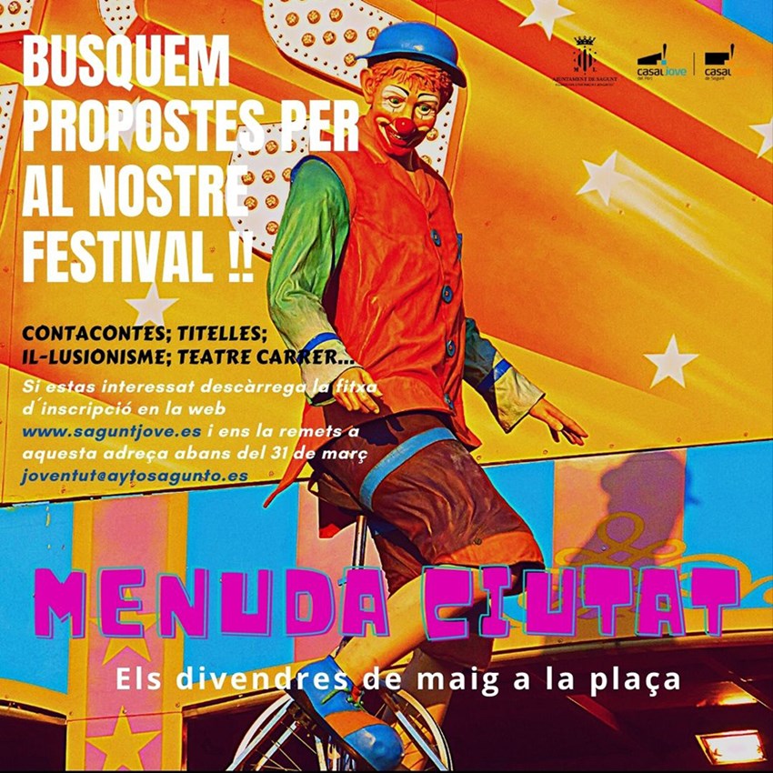 La Concejalía de Juventud e Infancia del Ayuntamiento de Sagunto vuelve a organizar el programa Menuda Ciutat: Els divendres a la plaça, un mini festival escénico para la población más pequeña con cuentacuentos, títeres, ilusionistas, teatro en la calle, magia, circo y todo tipo de entretenimiento que se celebrará en mayo de este 2022. Con el fin de elaborar la programación del mismo, se ha abierto el plazo de presentación de propuestas escénicas hasta el 31 de marzo.