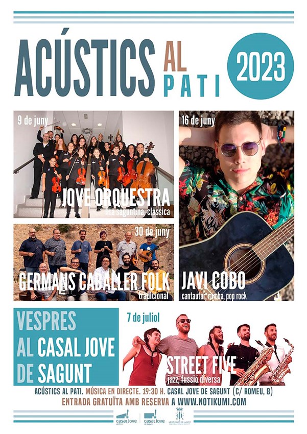 La concejalía de Juventud del Ayuntamiento de Sagunto, pone en marcha un nuevo proyecto cultural denominado Acústics al pati. Una iniciativa que pretende ofrecer una mini programación musical en formato acústico en el patio del Casal Jove de Sagunto. A través de cuatro conciertos se hará un breve recorrido que irá desde la música clásica, hasta el jazz, pasando por el folk local, la rumba y el pop.