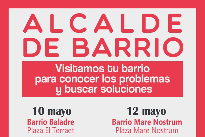 Así, este martes a las 19:00 horas Alcalde de Barrio acudirá a la plaza El Terraet de Baladre y el jueves a la misma hora hará lo propio en la plaza Mare Nostrum. La asistencia es abierta a todas las personas interesadas en plantear sus sugerencias o dudas al primer edil.