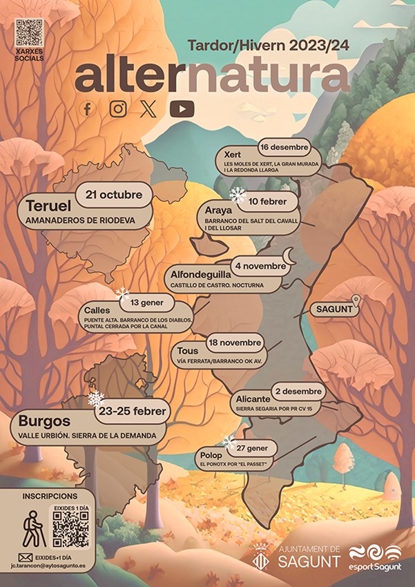 Si surgen preguntas sobre Alternatura se puede enviar un correo electrónico a alternatura@ayto-sagunto.es. Asimismo, para más información sobre la programación de las excursiones de la temporada otoño-invierno y para reservar plazas se tiene que consultar el siguiente enlace: https://aytosagunto.es/es/ayuntamiento/areas-y-servicios/actividad-fisica-salud-y-deportes/alternatura/.