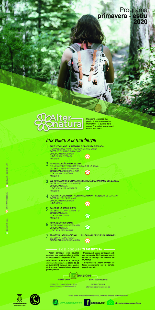 La delegación de Deportes ha presentado la programación de la temporada primavera-verano 2020 de Alternatura. Este proyecto está enmarcado dentro del área de actividad física y salud, del departamento de Deportes de Sagunto, y tiene como objetivo promocionar la práctica deportiva de montaña y facilitar el acceso a los ciudadanos a este tipo de actividades. Esta edición incluye siete actividades: seis rutas de montaña y una acuática. Cuatro de las salidas son por la Comunidad Valenciana y el resto a Teruel, Lérida y Bulgaria.
