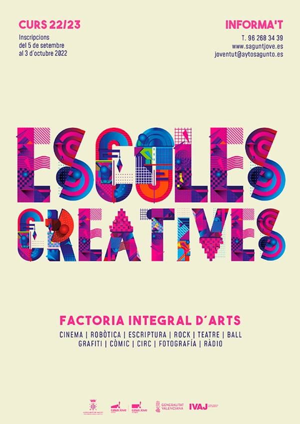 Las Escuelas Creativas - Factoría integral de artes son una iniciativa que se enmarca dentro del programa Cultura Jove de la Concejalía de Juventud e Infancia del Ayuntamiento de Sagunto y las acciones del departamento van más allá de la mera formación para la creación. A esta labor se suman otros recursos y proyectos como las salas de ensayo, los Lab creativos o el apoyo a diferentes proyectos culturales impulsados por colectivos juveniles. En definitiva, se trata de fomentar la acción creativa de la ciudadanía más joven apostando por la democracia cultural, que en lugar de espectadores crea ciudadanía.