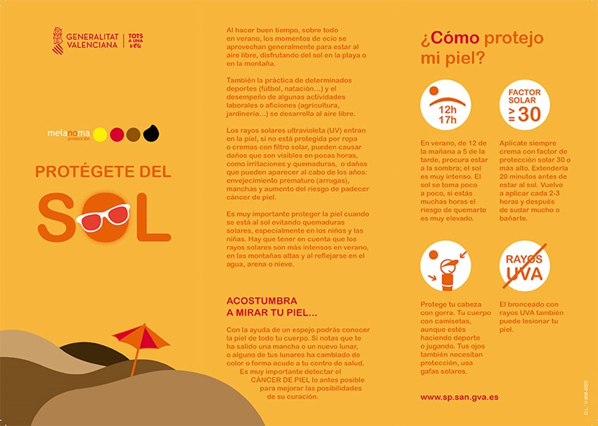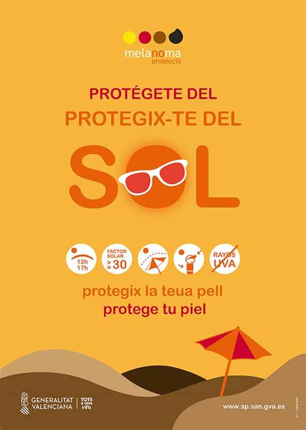 El departamento de Sanidad del Ayuntamiento de Sagunto se suma a la difusión de la campaña informativa Protégete del sol lanzada por la Conselleria de Sanidad Universal y Salud Pública de la Generalitat Valenciana con el objetivo de concienciar a la población sobre la importancia de proteger la piel y tener precaución ante la exposición al sol con el fin de prevenir el melanoma.