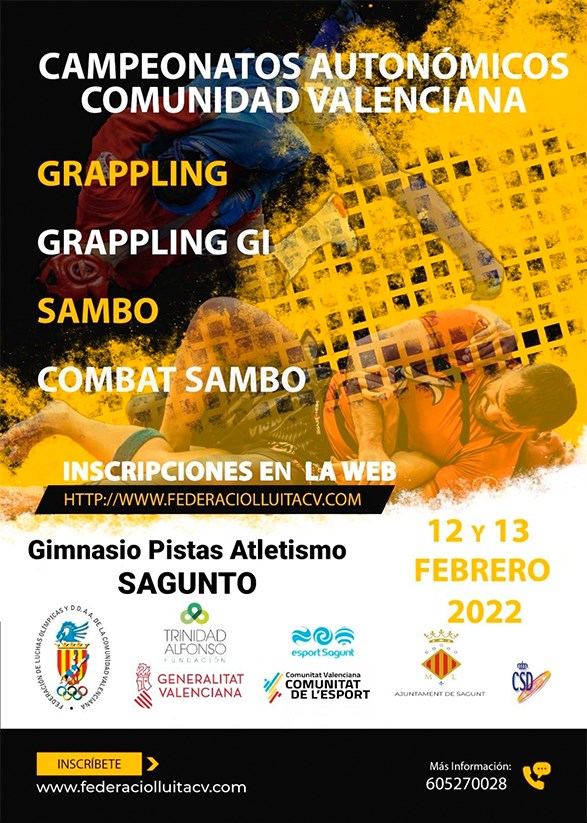 El próximo fin de semana, 12 y 13 de febrero, se disputarán en Sagunto los Campeonatos Autonómicos de las modalidades deportivas de lucha: Grappling, Grappling Gi, Sambo y Combat Sambo, en el pabellón interior del Polideportivo Municipal (internúcleos) de Sagunto. El evento está organizado por el Club de Lluita Camp de Morvedre y la Federación de Luchas Olímpicas de la Comunidad Valenciana en colaboración con el departamento de Actividad Física, Salud y Deportes del Ayuntamiento de Sagunto.