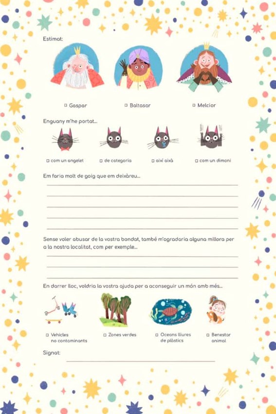 La carta incluye en la parte interior dibujos con vocabulario básico en valenciano y un espacio para que los niños y niñas hagan sus peticiones personales a Melchor, Gaspar y Baltasar, pero también incluye unos apartados más solidarios con buenos deseos y mejoras para la ciudad y para el mundo. Además, se dispone de la versión en blanco y negro para ser coloreada y sacar más provecho de la actividad.