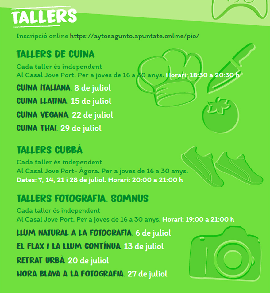 El primero de los talleres será el de la disciplina de fitness Cubbá hoy, martes 7 de julio, de 20 a 21 horas en el Casal Jove. Este taller se repetirá el 14, el 21 y el 28 de julio a la misma hora. Además también habrá talleres de cocina italiana, el 8 de julio; latina, el 15 de julio; vegana, el 22 de julio, y thai el 29 de julio, también en el Casal Jove.