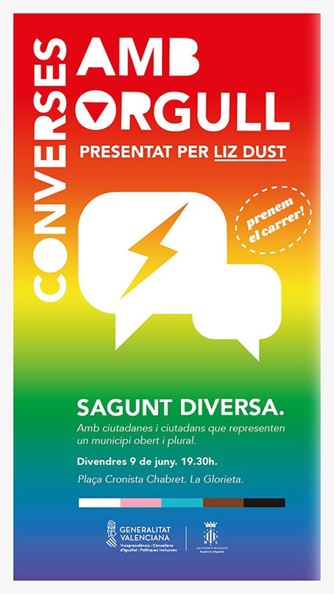 Converses amb Orgull están organizadas por la Vicepresidencia y Conselleria de Igualdad y Políticas Inclusivas junto a la concejalía de Igualdad del Ayuntamiento de Sagunto. Cabe mencionar que esta iniciativa pretende acercar a la ciudadanía las vivencias y trayectorias vitales de personas del colectivo LGTBI+, así como sus experiencias y las dificultades que se han encontrado.