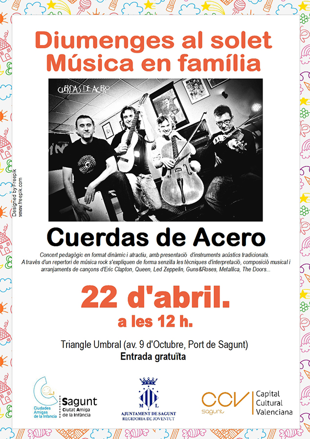 El grupo Cuerdas de Acero abre ‘Els Diumenges al Solet’, un ciclo de conciertos familiares los domingos por la mañana en distintos espacios de la ciudad. El primer concierto, gratuito, será en el Triángulo Umbral de Puerto de Sagunto el domingo 22 de abril a las 12 h. Esta actividad está organizada por el departamento de Juventud del Ayuntamiento de Sagunto.