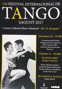 Los coordinadores del festival en Sagunto con el delegado de Cultura, José Manuel Tarazona, en la presentación de la programación del festival ante los medios.El Centro Cultural Mario Monreal de Sagunto acoge, después de cuatro años sin realizarse, una nueva entrega del Festival de Tango de Sagunto, organizado por la delegación de Cultura. En su edición número trece, el Festival se extenderá a lo largo del viernes 20 y el sábado 21. Todos los actos serán gratuitos salvo el espectáculo final, que tendrá un precio de 7 euros y unirá música, voz y baile.