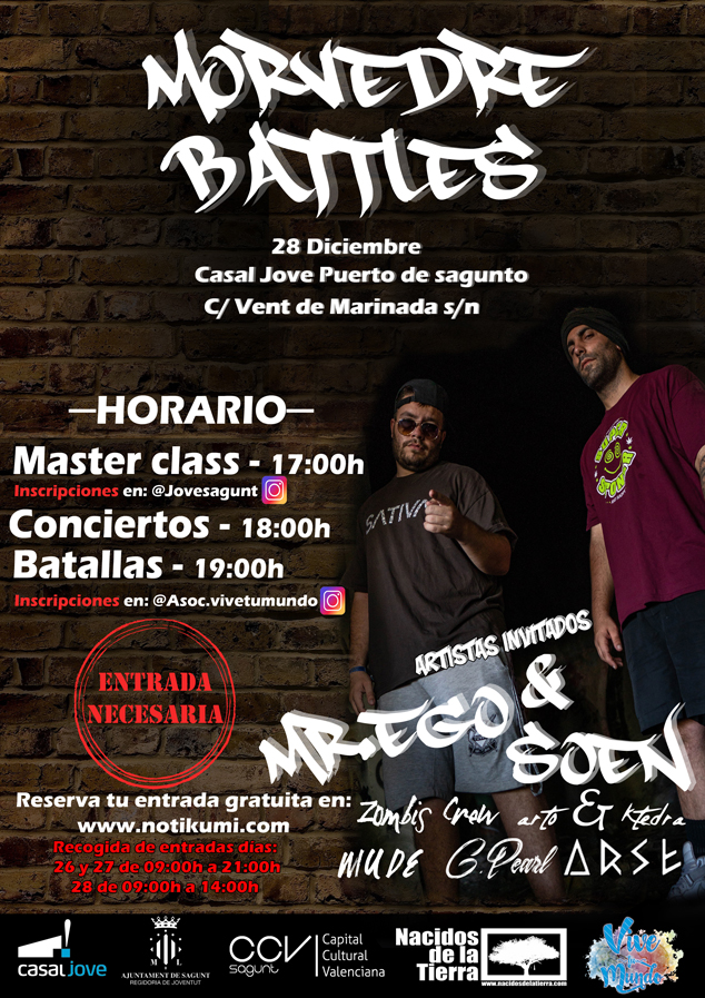 La delegación de Juventud del Ayuntamiento de Sagunto ha organizado el 28 de diciembre en el Casal Jove el evento ‘Morvedre Battles’. A las 17 h tendrá lugar una master class, a las 18 h los conciertos y a las 19 h batallas, donde raperos podrán luchar en el arte de la improvisación.