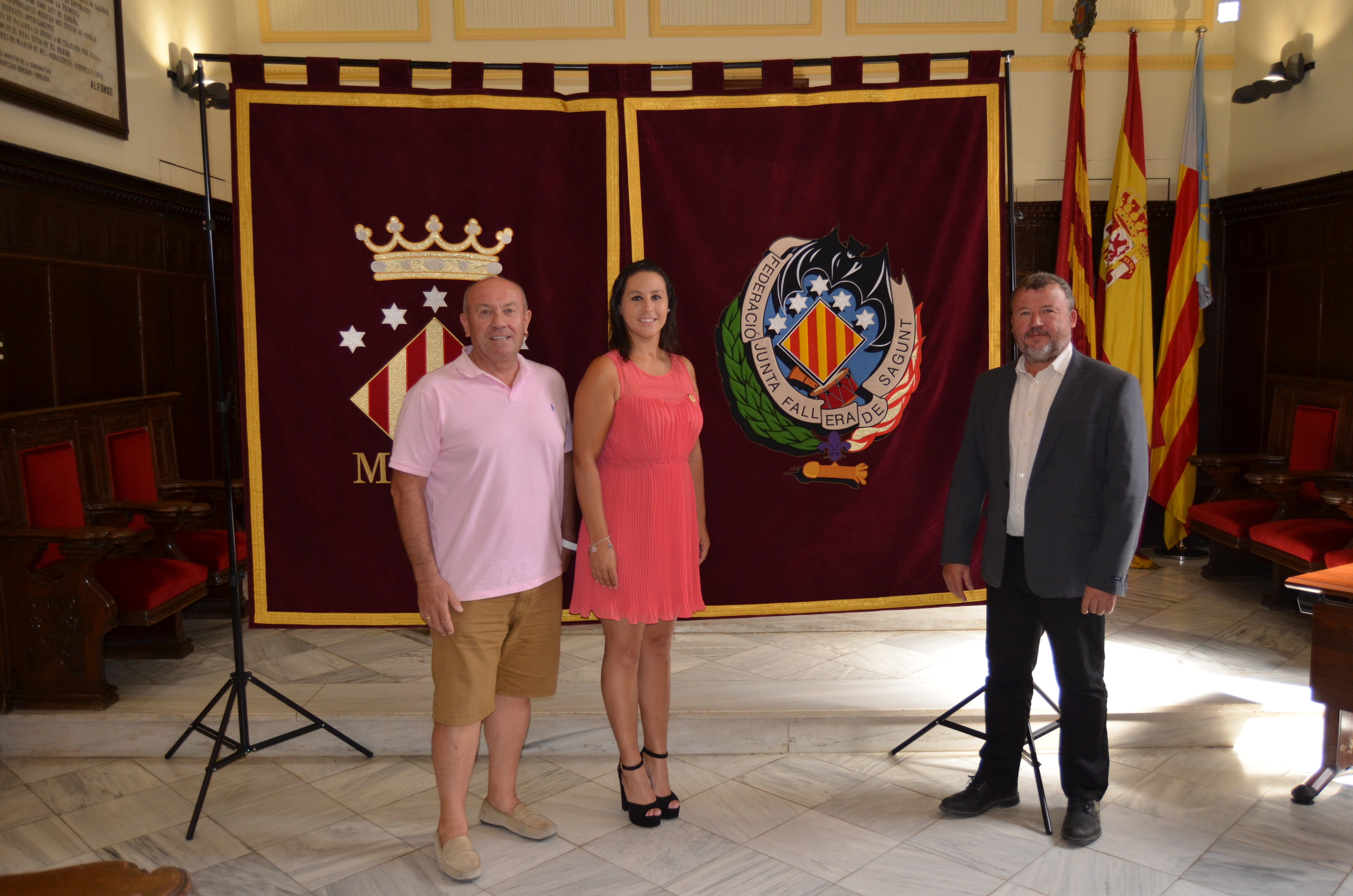 El alcalde de Sagunto, Quico Fernández, ha entregado al presidente de la Federación Junta Fallera de Sagunto, Rafa Burgos, y a la Fallera Mayor de la Comarca, Beatriz Alós, los reposteros con el escudo del Ayuntamiento de Sagunto y la Federación fallera, elementos que presidirán mañana el acto de exaltación de las nuevas Falleras Mayores de la Comarca en el Teatro Romano de Sagunto.