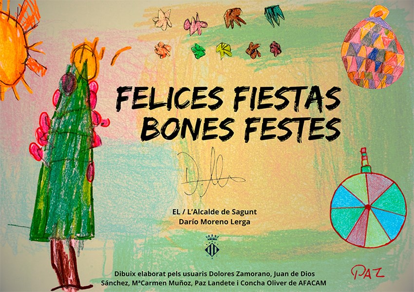 Este año la postal del departamento de Alcaldía ha sido elaborada con la colaboración de la Asociación de Familiares de Personas con Enfermedad de Alzheimer y Otras Demencias del Camp de Morvedre y Puçol (AFACAM). El diseño de la felicitación navideña es el resultado de integrar elementos de diversos dibujos trazados por los siguientes cinco usuarios y usuarias de AFACAM: Dolores Zamorano, Juan de Dios Sánchez, Ma Carmen Muñoz, Paz Landete y Concha Oliver.