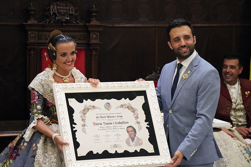 El alcalde de Sagunto manifestó que las Fallas son mucho más que los monumentos efímeros de cartón y madera: «Son el reflejo de nuestra identidad como pueblo. En cada resplandor de la hoguera, en cada chispa que se eleva hacia el cielo, las Fallas se alzan como símbolo de unidad y vínculo entre todos los valencianos. Son el hilo dorado que teje los sueños de un pueblo, la paleta de colores que pinta nuestras calles de pasión y alegría. Como las piezas de un puzle ancestral, las Fallas encajan en cada rincón de nuestra historia, amalgamando tradición y modernidad, pasado, presente y futuro». Darío Moreno también destacó lo que supone ser proclamada Fallera Mayor: «Implica mucho más que llevar una banda, es un compromiso con nuestras raíces, cultura e historia, es llevar en el corazón la pasión de nuestras Fallas y la responsabilidad de transmitir esta pasión a todos aquellos que se acerquen a nosotros».