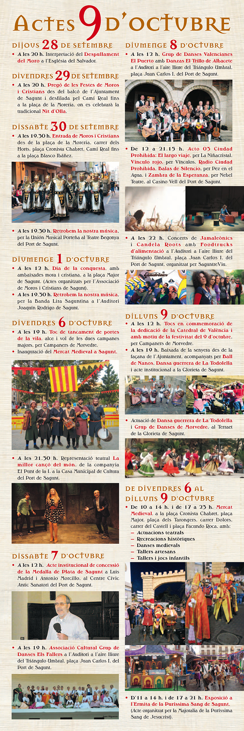 En el mercado medieval tendrán lugar actuaciones teatrales, recreaciones históricas, danzas medievales, talleres artesanos y talleres y juegos infantiles. El programa de actos también ofrecerá actuaciones musicales a cargo de la Banda Lira Saguntina y la Unión Musical Porteña, entre otros, además de numerosos espectáculos de danza.
