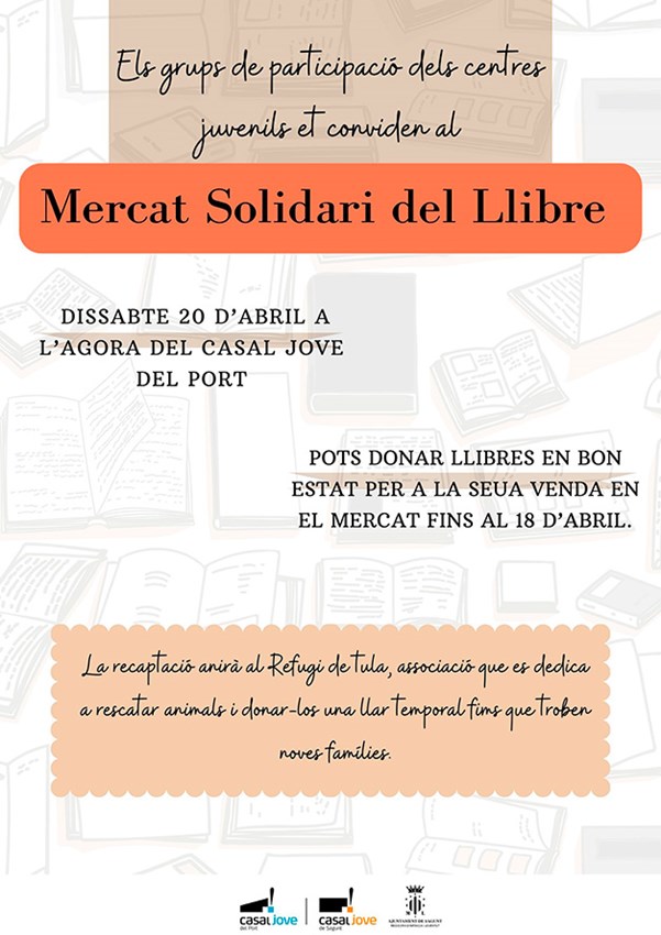 Los grupos de participación de los Casales Jóvenes del municipio organizan un mercado solidario de libros que tendrá lugar en el ágora del Casal Joven de Puerto de Sagunto durante la mañana del sábado 20 de abril (de 10:30 a 13:30 horas). Mediante esta iniciativa, organizada por la concejalía de Juventud e Infancia con motivo del Día del Libro (23 de abril), se fomenta la lectura y la solidaridad, ya que todos los beneficios recaudados serán donados a la protectora de animales El Refugio de TULA.
