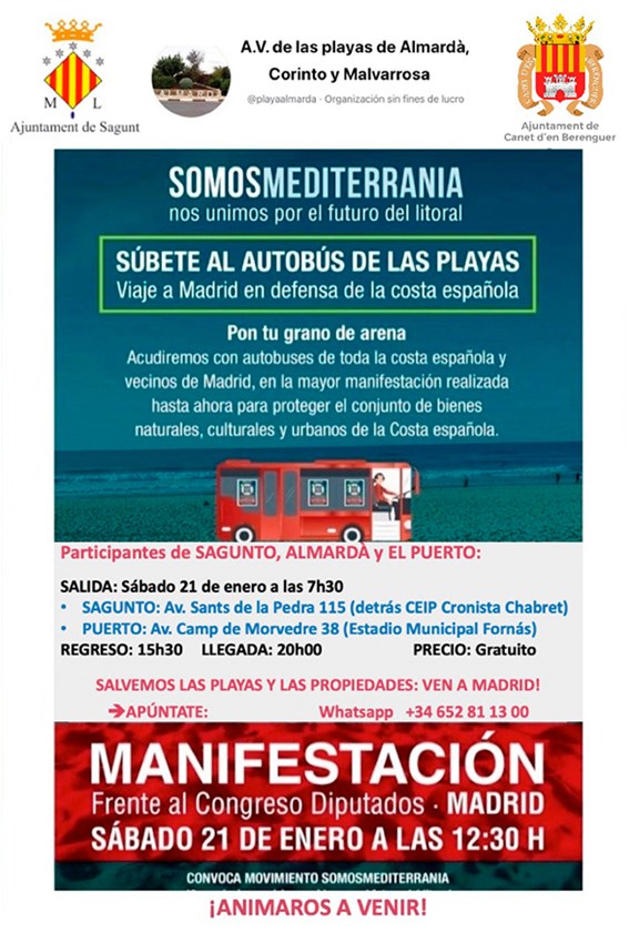La Asociación de Vecinos de las playas de Almardà, Corinto y Malvarrosa ha organizado, con la colaboración del Ayuntamiento de Sagunto y el Ayuntamiento de Canet d’en Berenguer, un ‘autobús de las playas’ que viajará hasta Madrid para la manifestación en defensa de la costa española.