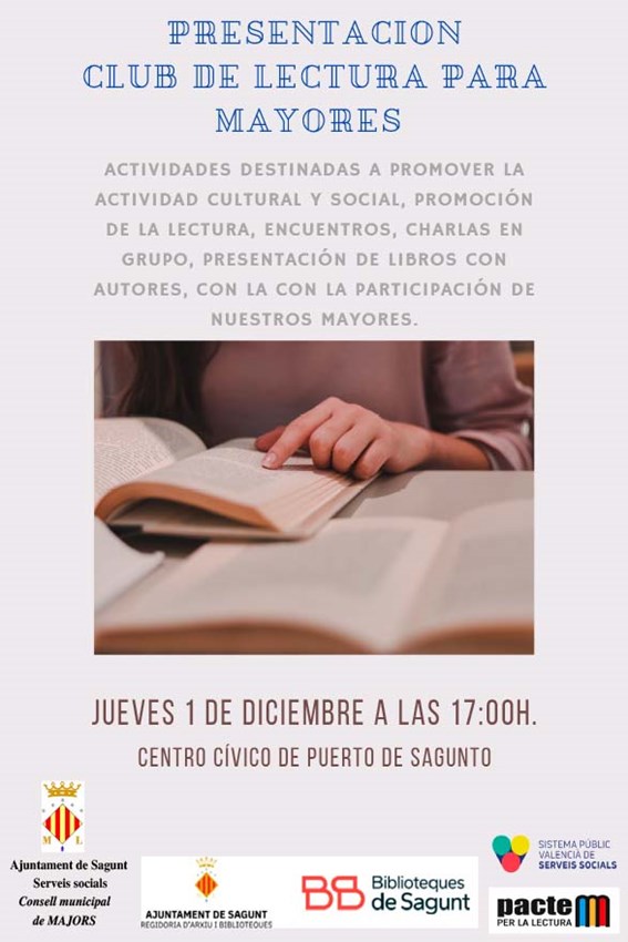 El departamento de Personas Mayores del Ayuntamiento de Sagunto, encabezado por el concejal Alejandro Sotoca, en su compromiso con el Plan Sagunto, Ciudad Amigable con las personas mayores presentan la iniciativa de creación de un Club de Lectura para Mayores del municipio con actividades destinadas a promover la actividad cultural y social a través de la promoción de la lectura, desarrollando entre otras, actividades de encuentros de lectura, charlas grupales y presentación de libros.