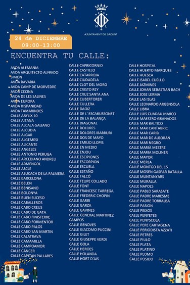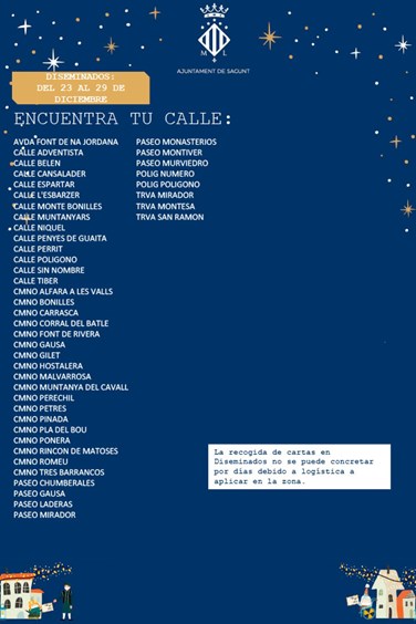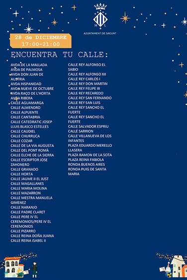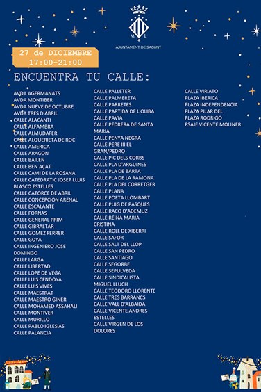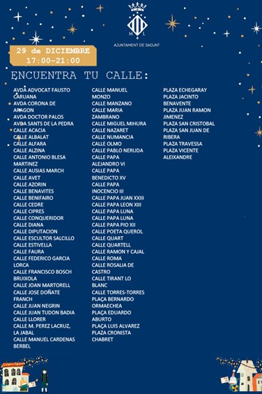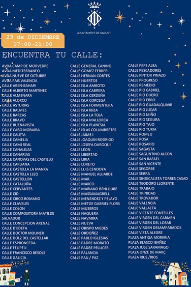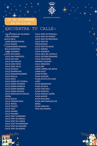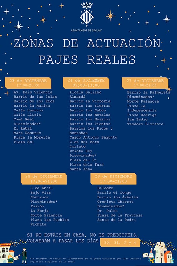 El Ayuntamiento de Sagunto ha dado a conocer las zonas de actuación, así como las fechas de la comitiva de Pajes Reales. Debido a la demanda ciudadana por saber qué día pasarán los pajes por las casas de los niños y niñas de la ciudad, desde Alcaldía y de la delegación de Juventud e Infancia se ha emitido un listado de calles, fechas y horarios.